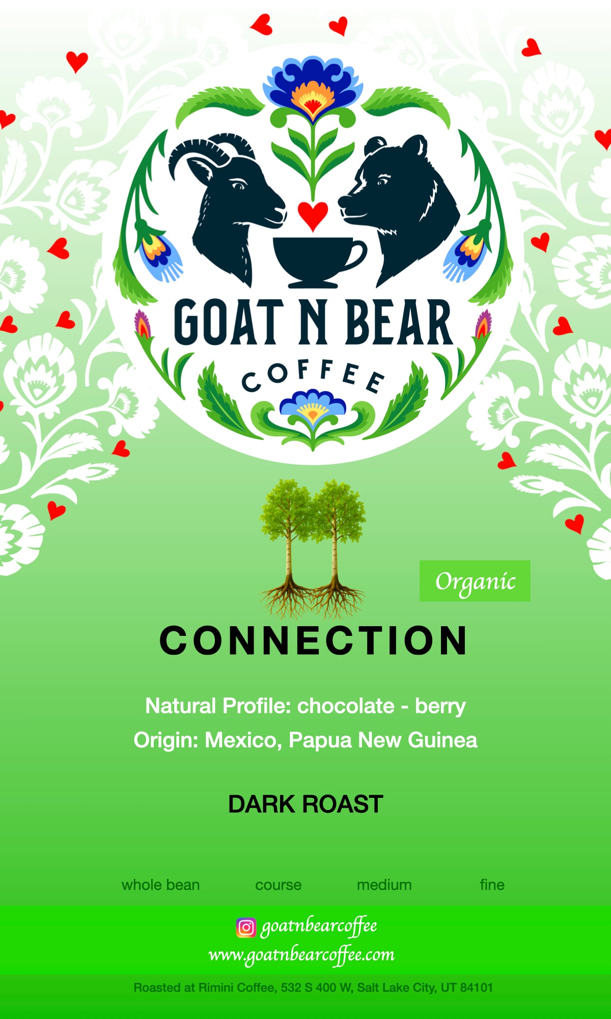 Connection is an organic dark roast coffee sourced from Mexico and Papua New Guinea. This rich, full-bodied coffee delivers deep flavors of chocolate and berry, creating a smooth, satisfying cup that brings people together.